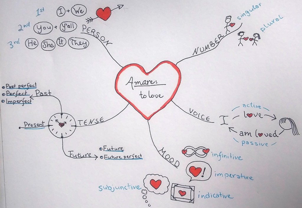 In the meantime, to help make it easier, here’s a diagram for you. This picture illustrates things the forms/endings of a Latin verb show–person, number, tense, mood, and voice. I chose to use that ever-popular example amare/to love (think “amo, amas, amat…”) in this image; thank goodness stick-men and hearts are so easy to draw!