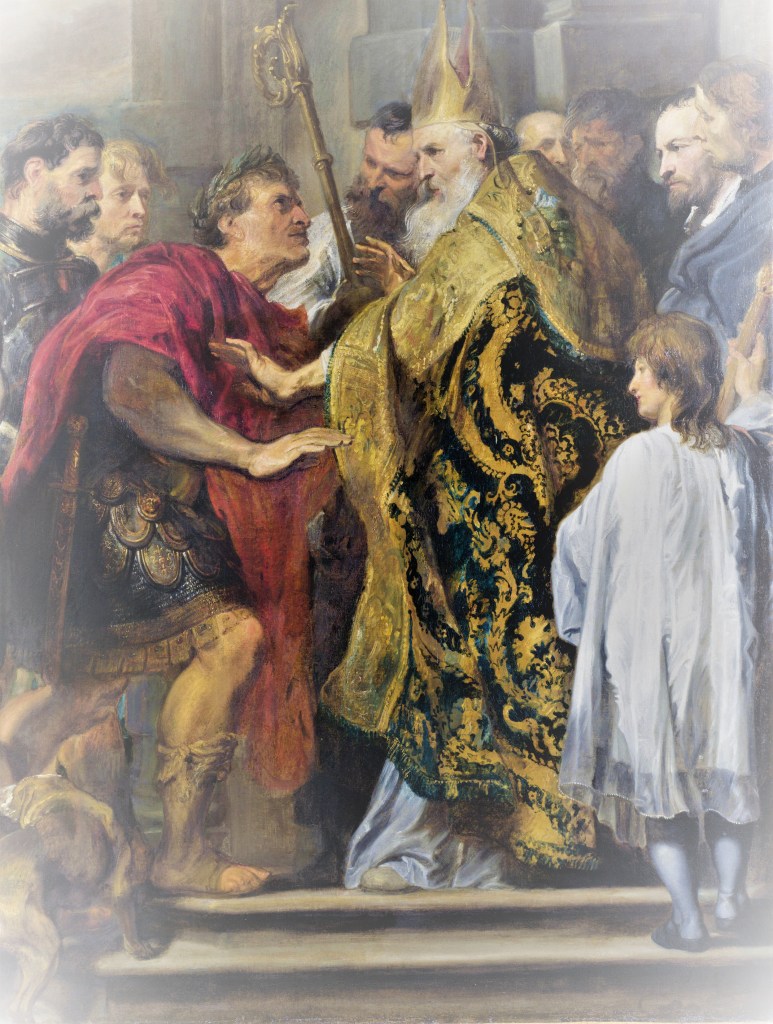 St. Ambrose is one of the Doctors of the Church. He was bishop of Milan the late 300s. His family was Christian, and powerful: his father had been commander of the Emperor’s body guard in Gallia. After his studies, Ambrose soon became the governor of Aemilia-Liguria. At this point he still was an unbaptized catechumen: in those days parents often did not have their children baptized, so the children became professed and baptized Christians only as adults.