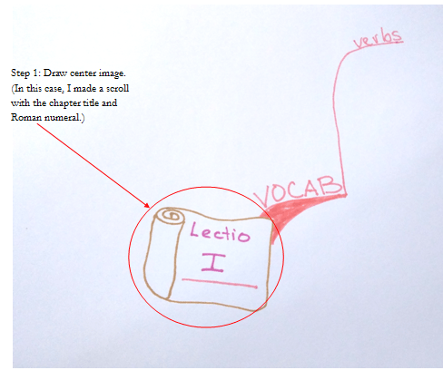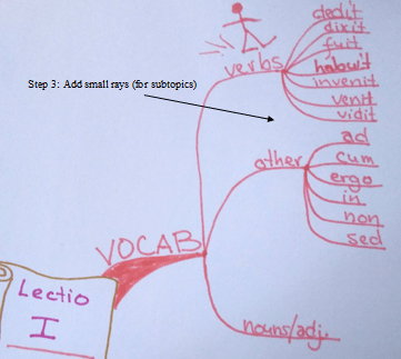 Step 4: Expand your Idea Map with more large and small rays. (In my example, Lectio I has two important sections to remember, the vocabulary list and the grammar rules.) As you practice with idea-mapping, try adding symbols and drawings. I put walking stick-man legs over “verbs” to show an action, since verbs are action words, and used an arrow and a circle-slash “not” symbol in the grammar section. Drawings and symbols cut down on word clutter and are more fun to look at and easier to remember.