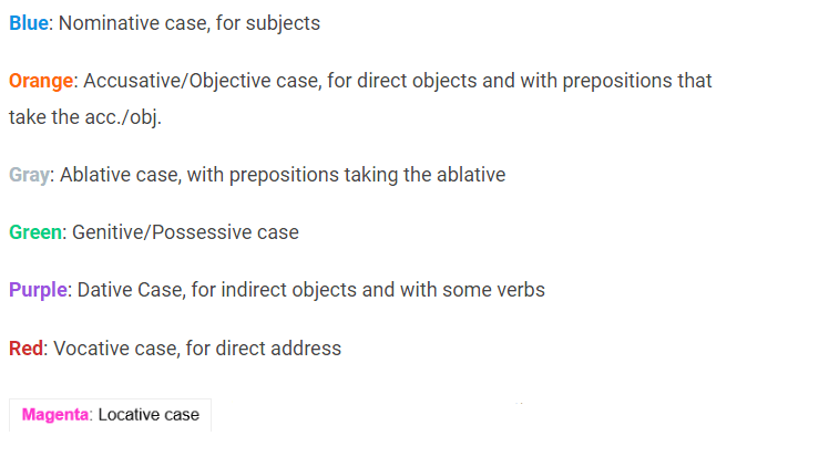 * Key for Latin Case-Colors: